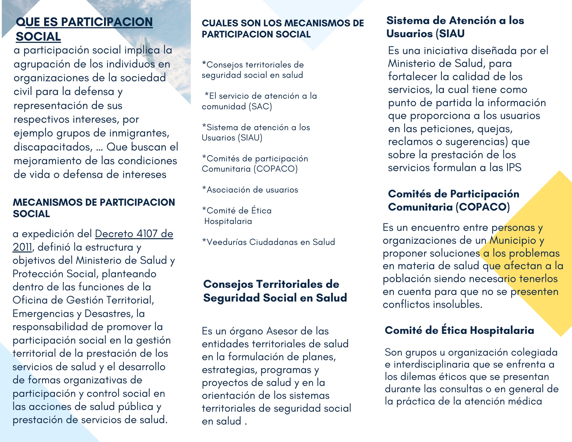 Participación social: Es un proceso de interacción social para intervenir en las decisiones de salud respondiendo a intereses individuales y colectivos para la gestión y dirección de sus procesos en la búsqueda de bienestar humano y desarrollo social. Comprende la participación ciudadana y comunitaria. Consulte Aqui la politica de participación nacional.