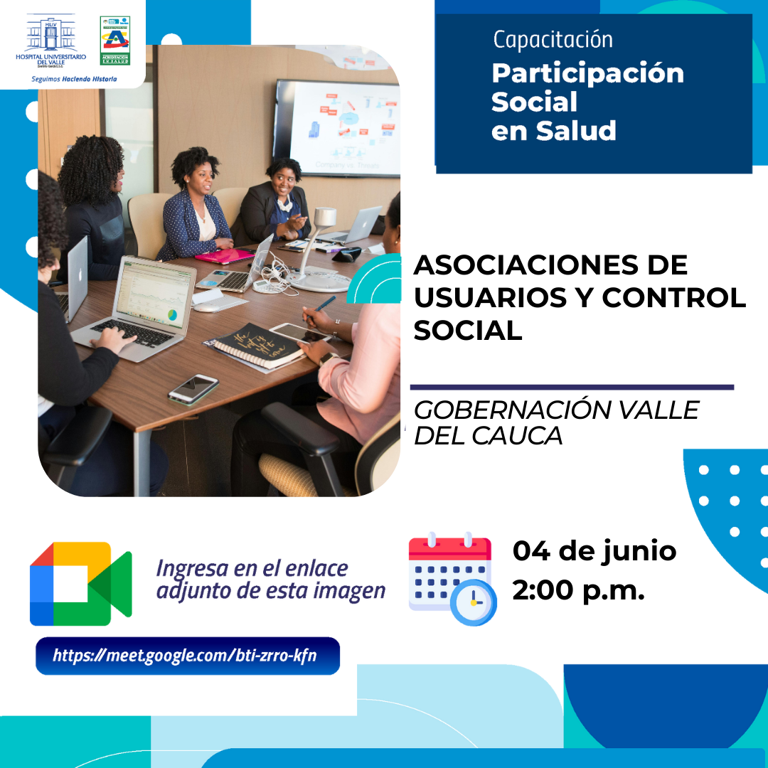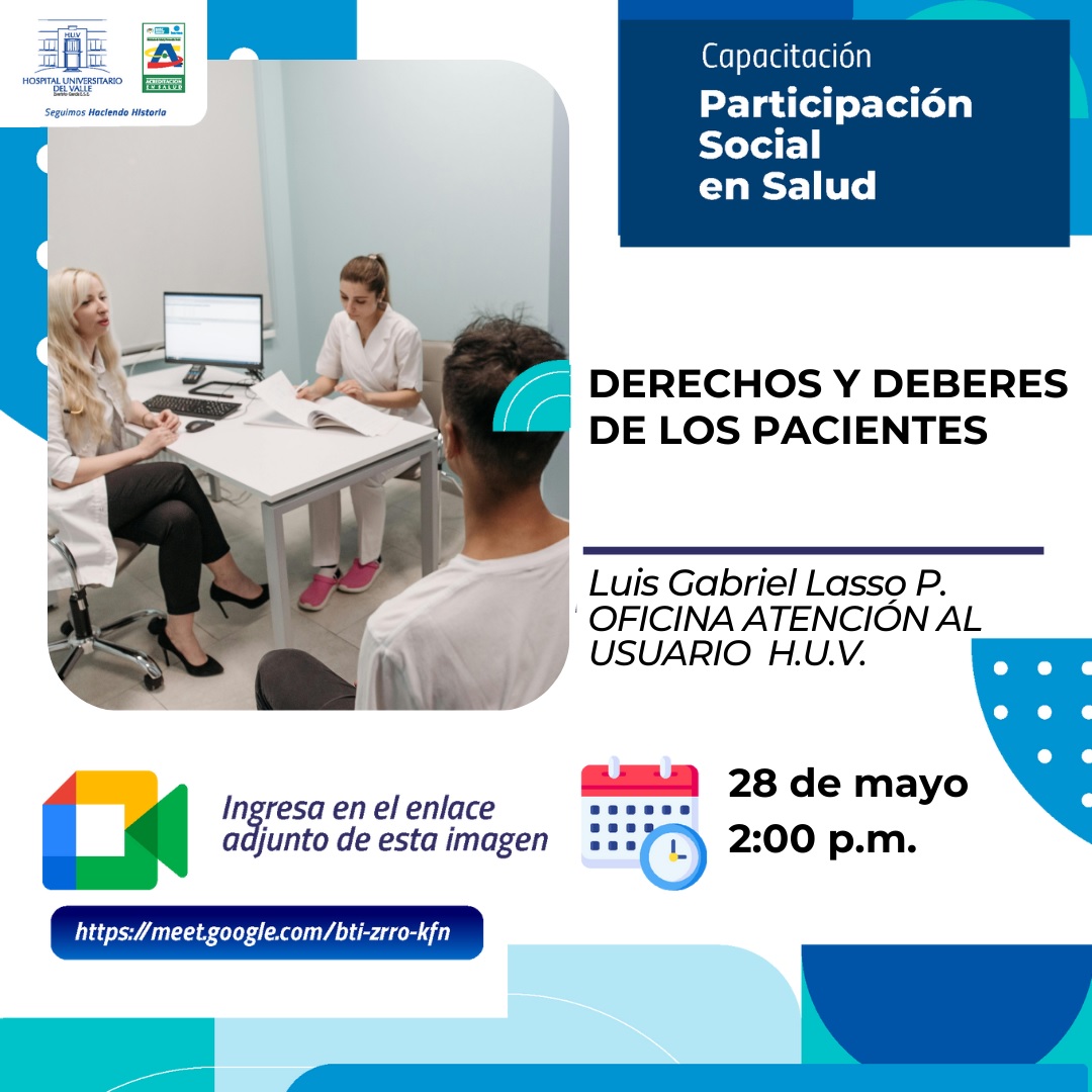 La Oficina de Atención al Usuario del Hospital Universitario del Valle "Evaristo García" E.S.E., tiene el gusto de invitar a la charla de orientación virtual Cronograma Participación Social en Salud por la Plataforma Google Meet.